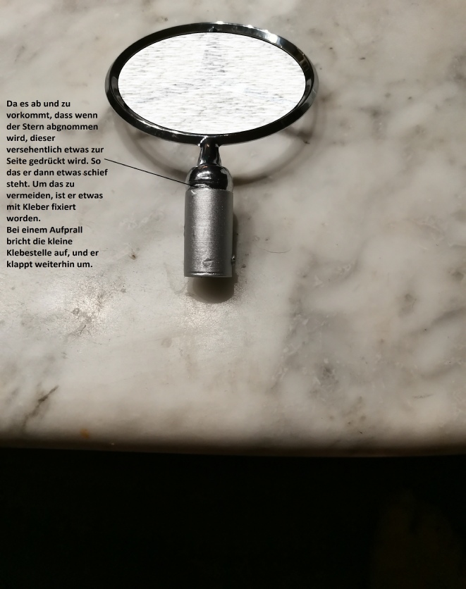 Wir haben hier mal gezeigt, dass der Stern auch schräggestellt werden kann, und nach hinten sich komplett umlegt. Es kann natürlich mal passieren, dass Sie versehentlich den Stern etwas zur Seite drücken und er dann nicht mehr ganz gerade steht, weil Sie mit dem abnehmen noch nicht so vertraut sind. Es muss dann die Position wieder gefunden werden, in der der Stern wieder gerade steht. Am Stern ist ein Kugelgelenk mit 2 Noppen, in der Metallbuchse sind dafür